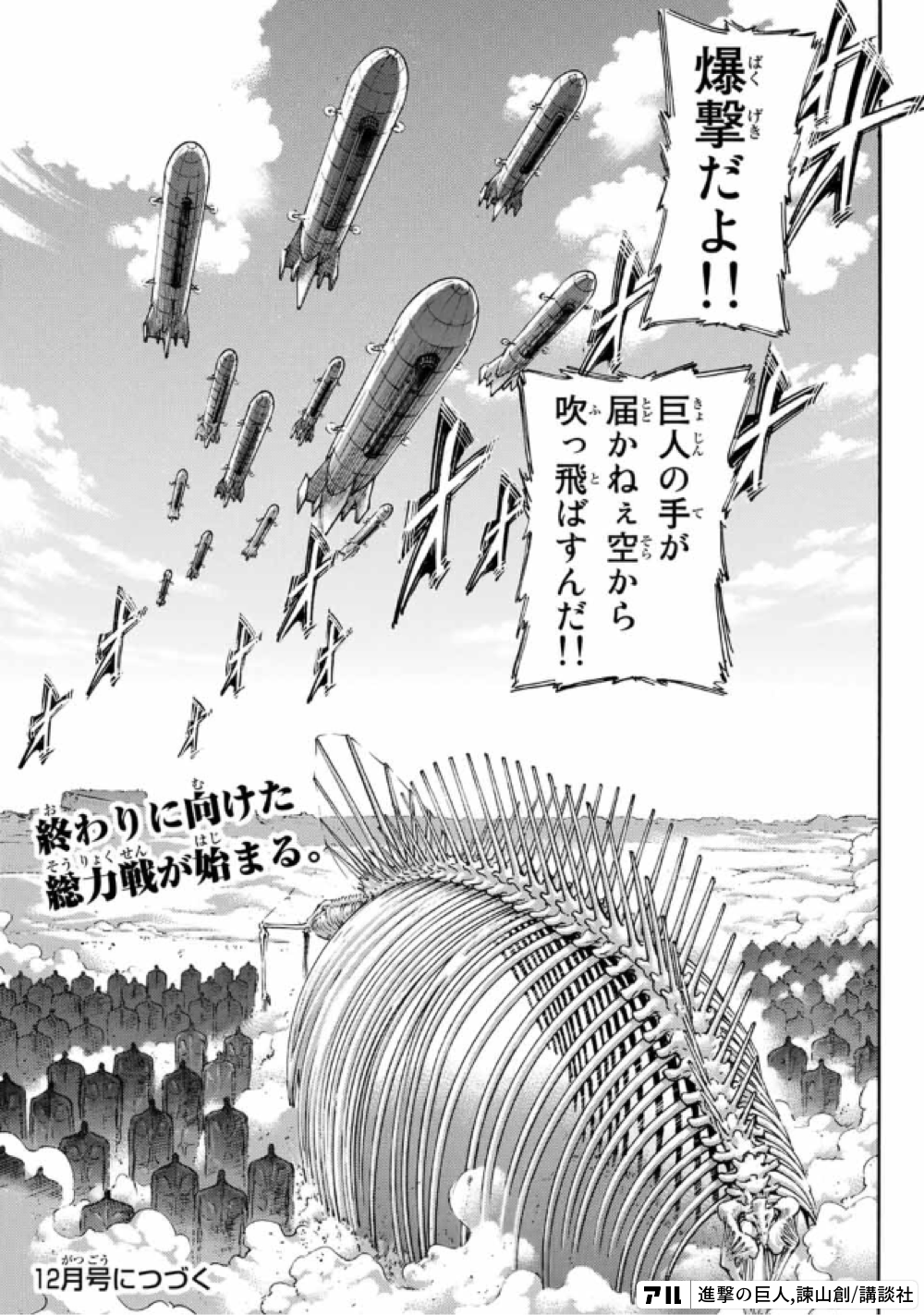 終わりに向けた総力戦が始まる 12月号につづく 巨人の手が届かねぇ空から吹っ飛ばすんだ 爆撃だよ 進撃の巨人 アル